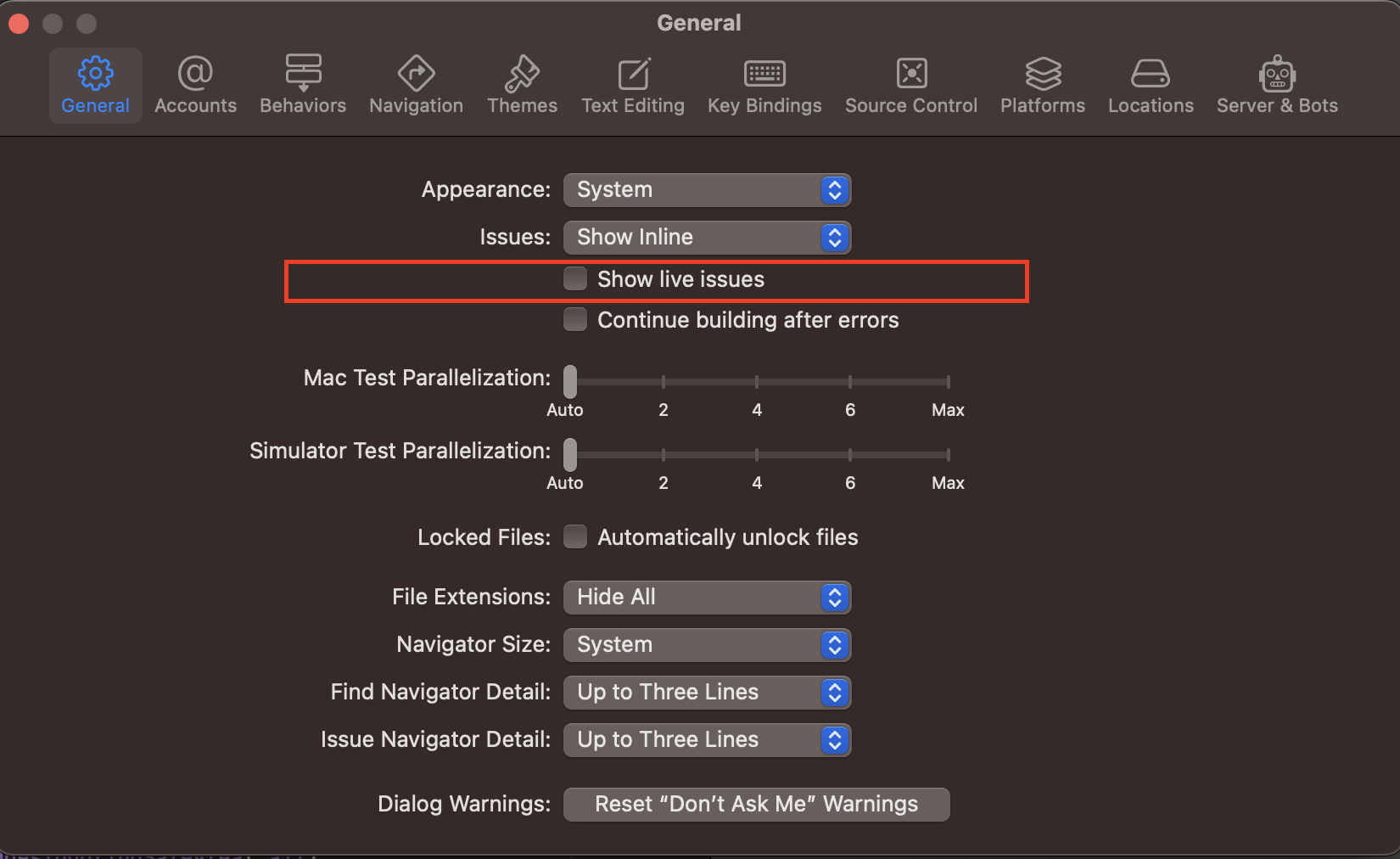 상단바에서 xcode > setting > General 탭 > show live issues를 껐다