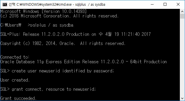 새 사용자, User 만들기 1. 윈도우 커맨드 창(명령 프롬프트)에 들어간다윈도우 + R ( 실행창 단축키)cmd (실행창에 cmd를 입력해 커맨드창 호출 ) 2. orale sql에 관리자로 로그인한다sqlplus / as sysdbacmd창에 sqlplus / as sysdba 입력하고 엔터, 띄어쓰기 주의관리자 아이디는 sysdba 또는 system이다. + oracle sql developer에서 관리자로 로그인 할 때 비밀번호는 oracle설치시 적으라고 했던 비밀번호다. 3. 접속이 되었으면 접속한 관리자 계정을 이용해 새 유저를 만들어준다.create user newuserid identified by password;create user 만들유저아이디 identified by 해당 유저의..